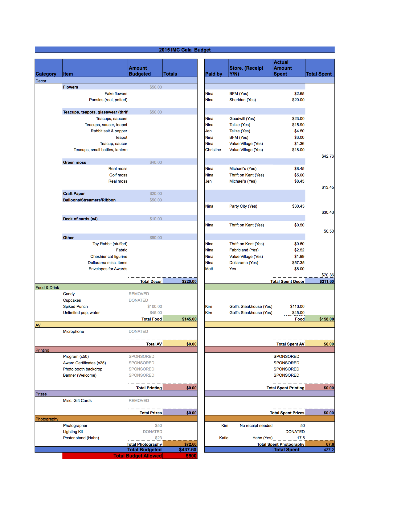 Here is a budget that I created for budgeting and tracking the final spend for all decor items for the event.